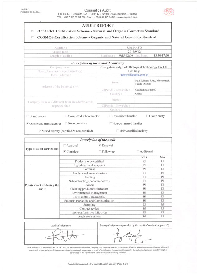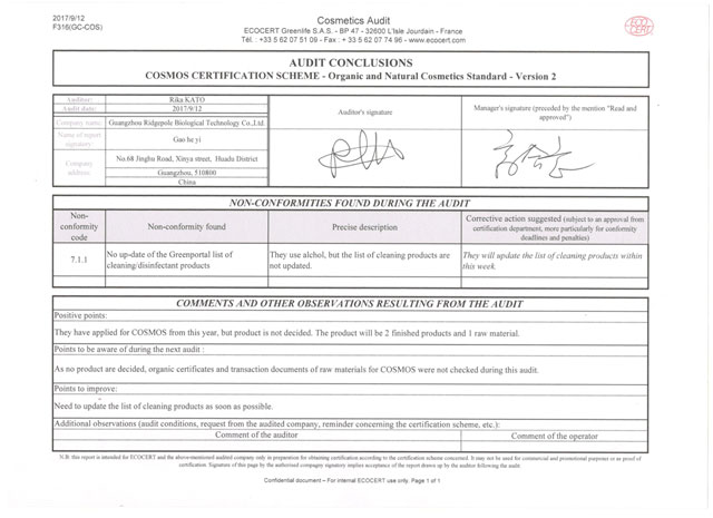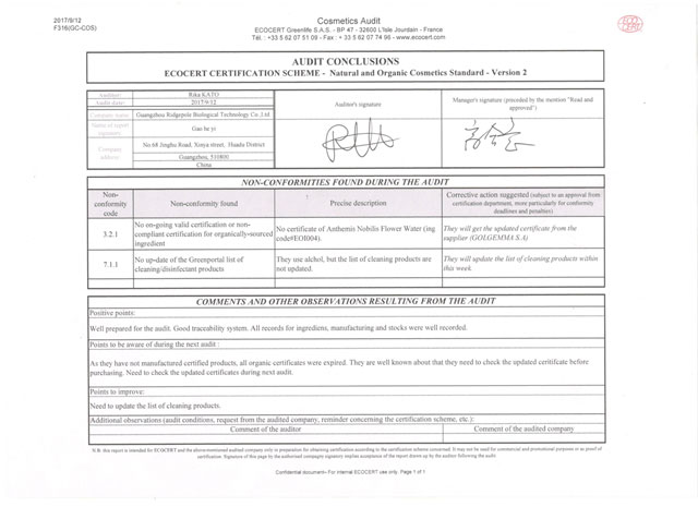 經(jīng)一系列嚴苛的文件資料審核、現(xiàn)場確認等程序,棟方股份順利通過檢查組一致確認,繼續(xù)保持“歐盟ECOCERT天然有機化妝品生產(chǎn)認證”榮譽資質(zhì)。