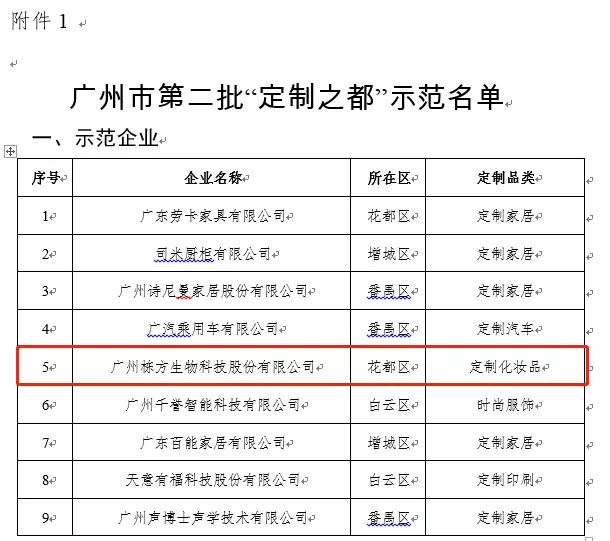 2021年10月20日,廣州市工業(yè)和信息化局官網(wǎng)公布了2021年廣州第二批“定制之都”示范單位入選名單,廣州棟方生物科技股份有限公司(簡(jiǎn)稱:棟方股份)入選為9家“示范企業(yè)”之一,同時(shí)棟方股份成為唯一一家化妝品定制入選的企業(yè),這是對(duì)棟方股份深耕化妝品研發(fā)、樹立化妝品行業(yè)標(biāo)桿的認(rèn)可。